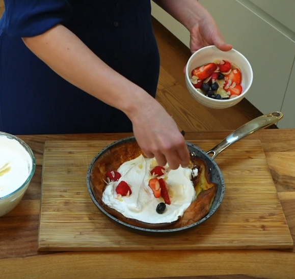 Pánvičku opatrně vyndejte z trouby, vhoďte do ní máslo a hned, jak se rozpustí, přilijte najednou těsto. Ihned vraťte pánev do trouby a pečte cca 15 minut. Palačinka by měla být krásně nadýchaná přečnívající přes okraje pánve a upečená do zlatohnědé barvy.